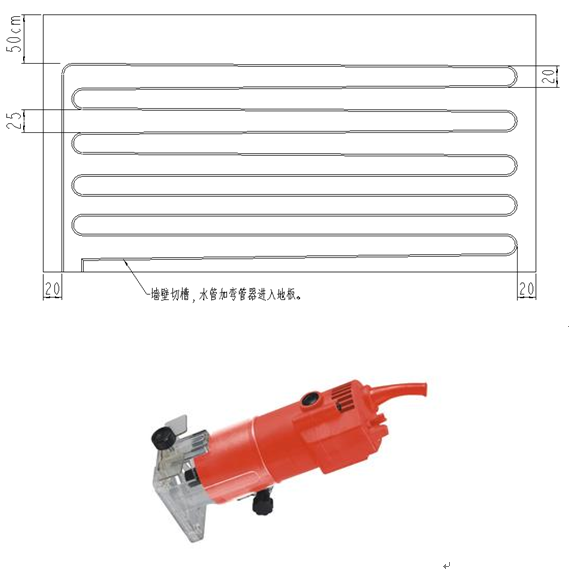 等墻壁上完全貼滿后,在保溫板的面上設計并畫好需要開槽的水路圖形。要求**上面管路的位置倒天花板的距離為50厘米;水路的兩端間距分別為20厘米和25厘米,間距20厘米的一端為圓弧過渡,保證水路為傾斜向下;水暖管路距離兩側的墻壁端距離約為20厘米。
